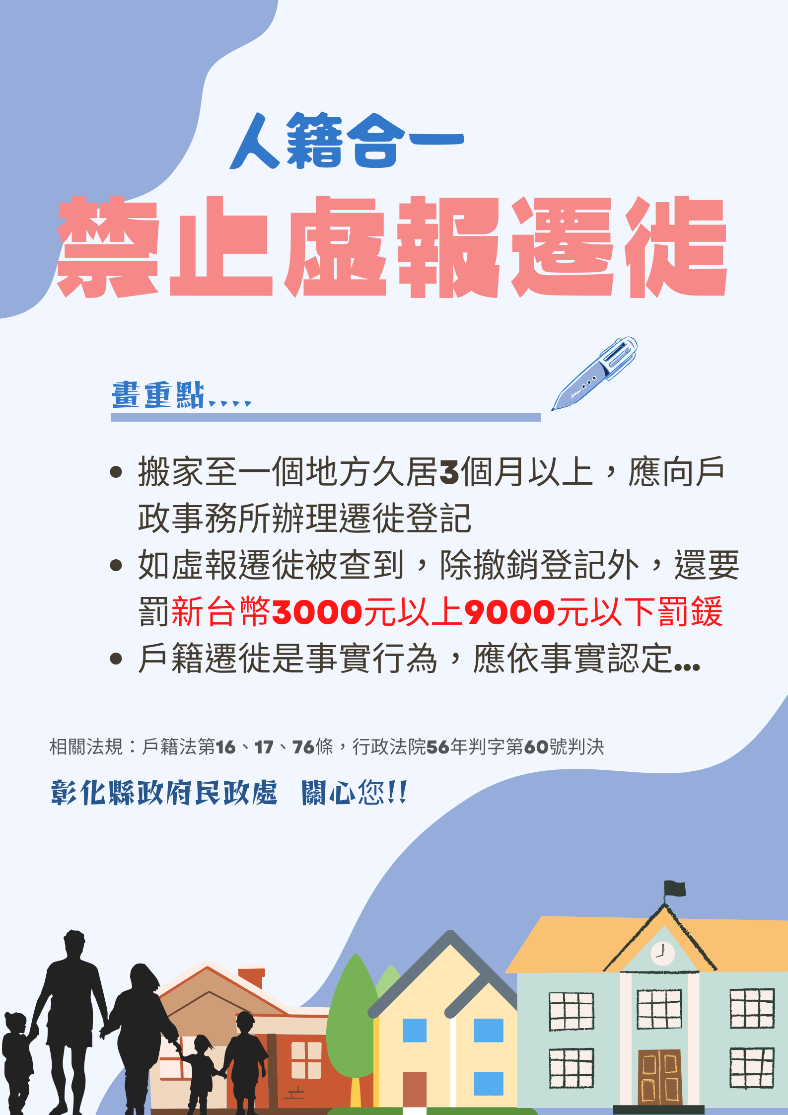 | 二、 | 為正確戶籍資料,檢附「人籍合一禁止虛報遷徙」海報電子 檔1份,請惠予協助張貼宣導。 |