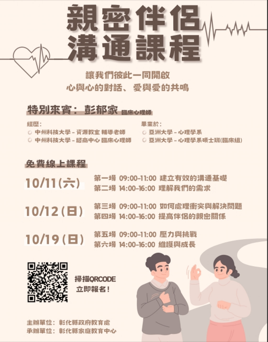 二、本案係藉由親密伴侶溝通課程,讓伴侶間在面對溝通困境時使用更正確的方式來因應,提供家庭教育數位學習的管道,維護家庭功能的運作,特辦理旨揭講座。